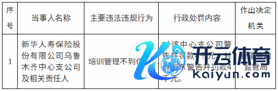 11月17日金融一線音問,新疆金融監管局行政處罰信息公示列走漏出,新華東說念主壽保障股份有限公司烏魯木皆中心支公司及相干攀扯東說念主因培訓措置不到位,被新疆金融監管局處罰,其中,對該中心支公司勸誡并罰金4千元開云體育(中國)官方網站,對肖振東勸誡并罰金4千元。